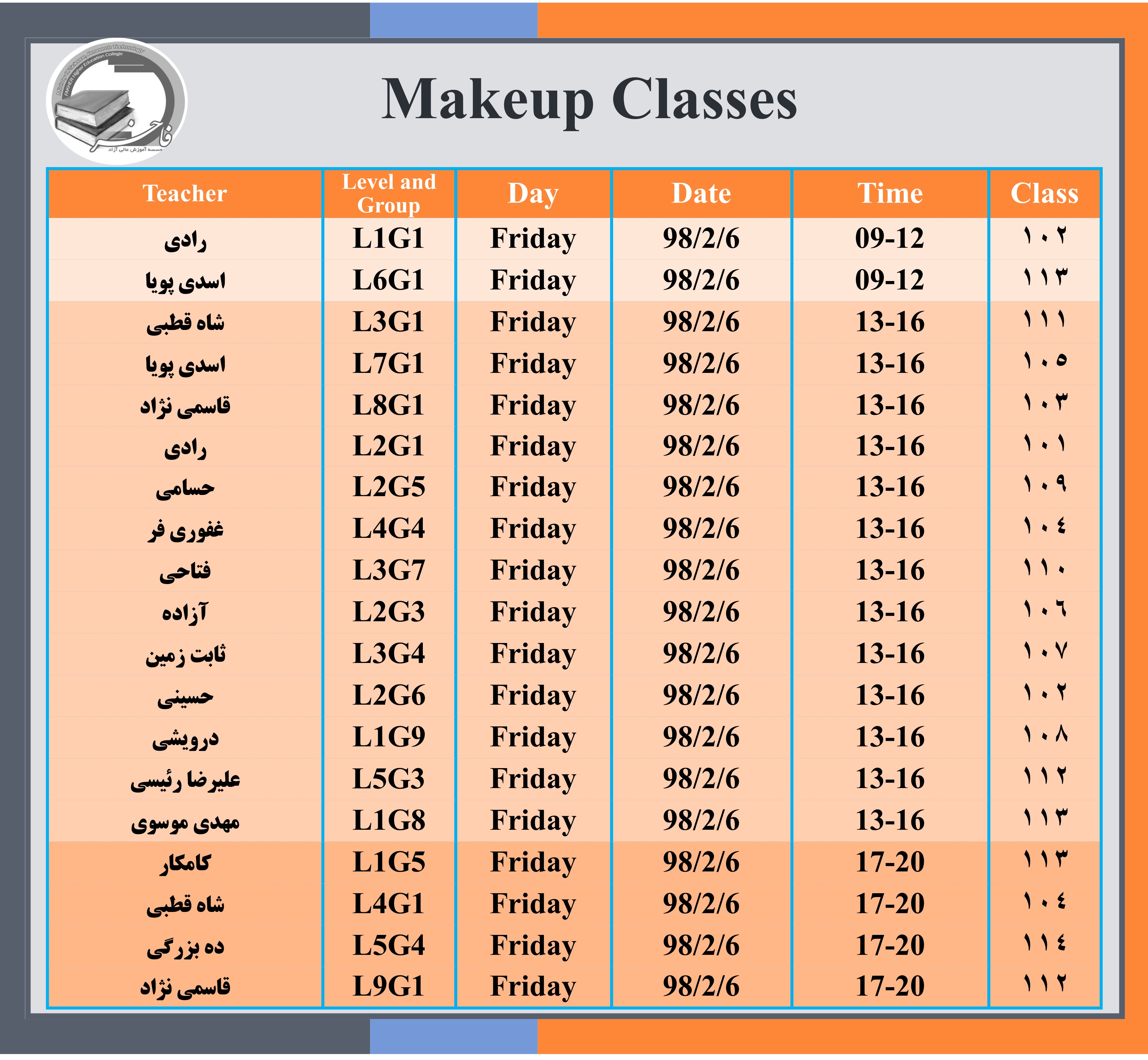 کلاس های جبرانی بهار 98 روز جمعه 6 اردیبهشت ساختمان قصردشت و ساختمان ارم